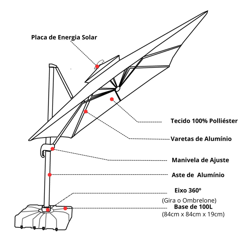 O Ombrelone Guarda Sol Gold Led Alumínio 3,0 x 3,0 C/ Base em 100 L é a escolha ideal para quem busca proteção solar premium aliada a um design moderno e elegante.